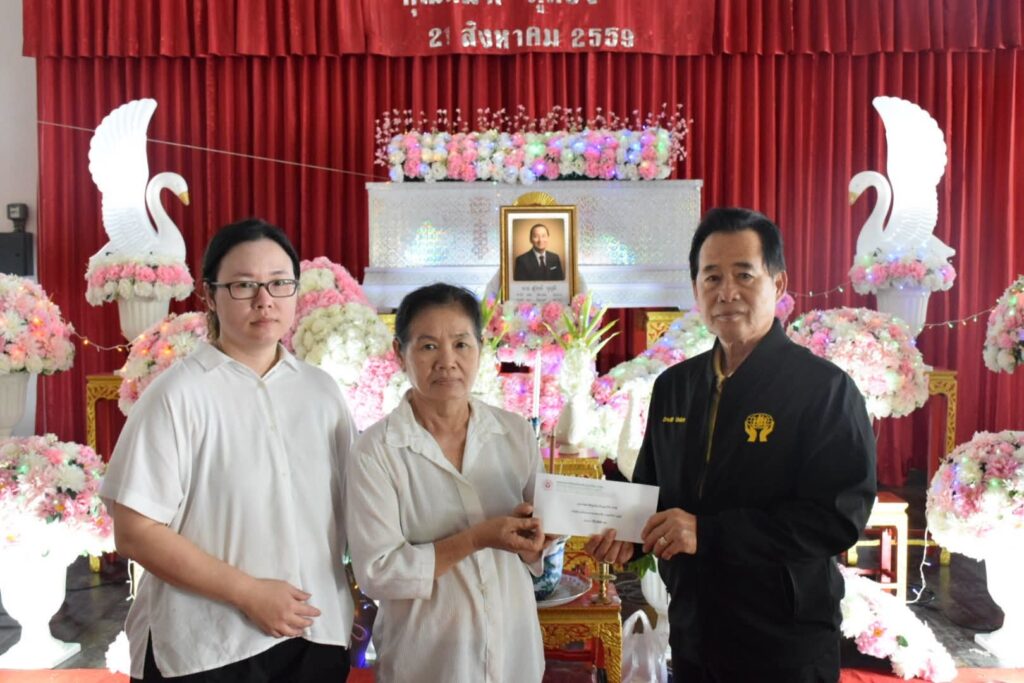 นายศักรินทร์ กิจสวัสดิ์ ผู้จัดการ เป็นตัวแทนสหกรณ์ มอบสวัสดิการเพื่อผู้เสียชีวิต ให้แก่ครอบครัวนางวีรวรรณ กิจบำรุง ณ ศาลาสันติสุข